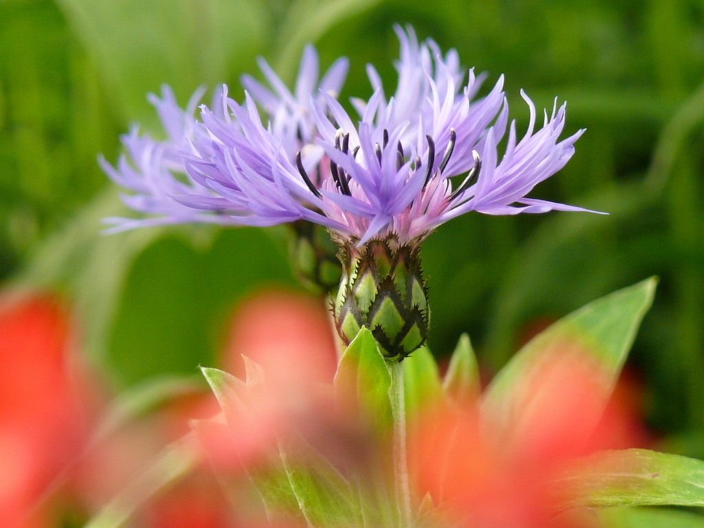 セントなんだかかんだか??っていう花です(笑)前ボケの赤はヒュ-ケラの花です。花も蕾の模様もア-ト的な植物です。