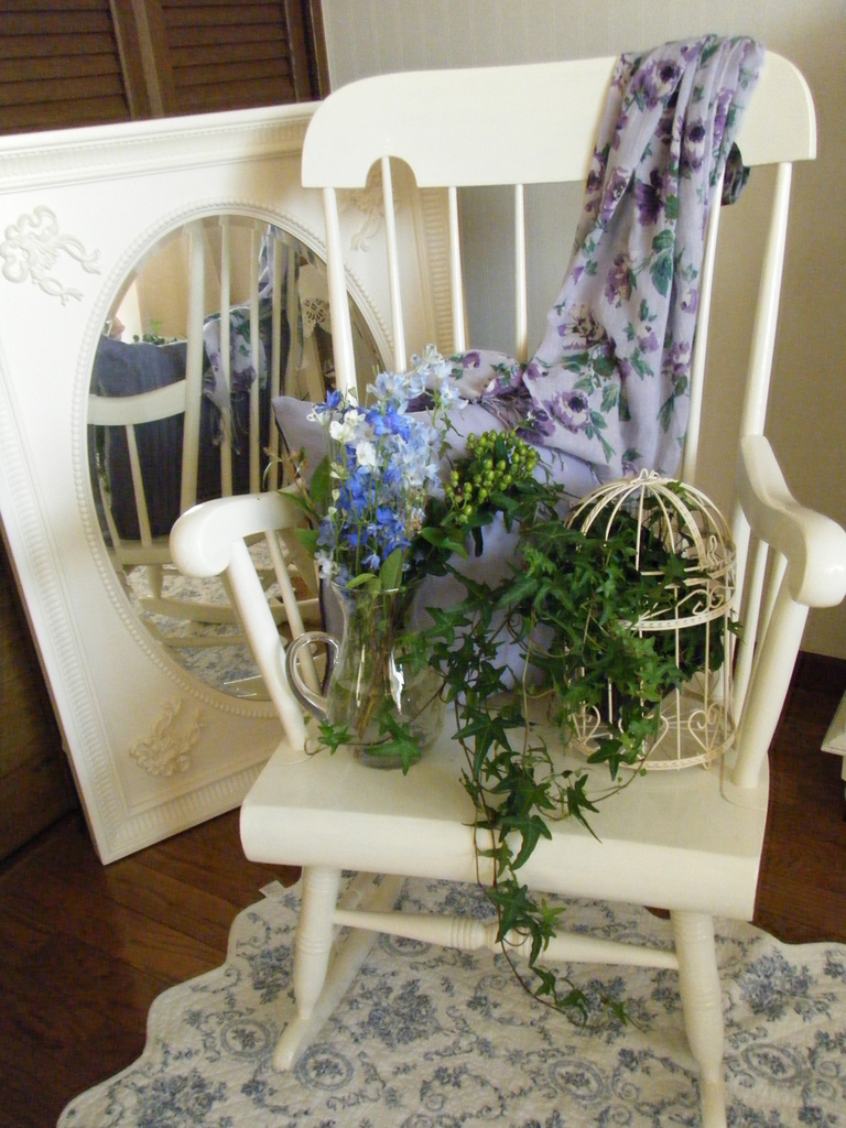 白くペイントしたロッキングチェアー、すてきですね。鏡やファブリック、花の色合わせも涼しげでよく似合っています。この椅子を見るたびにお母様との思い出がよみがえりそうですネ。