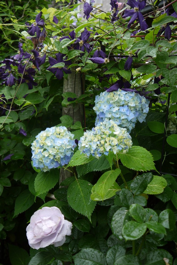 やっぱり青なんです。アジサイの下のブルーバユーがもっと咲いてる予定でしたが、雨で一個だけになってしまいました。