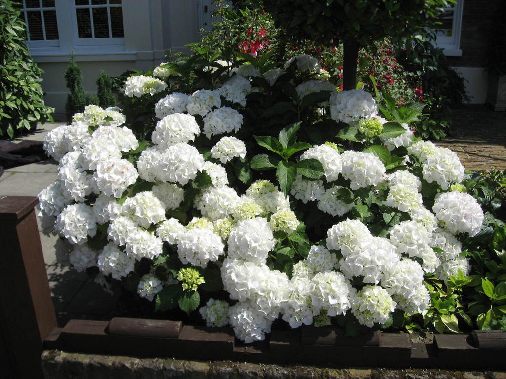 真っ白で大輪のアジサイすごくきれいですね。ライム色の花も素敵~♪