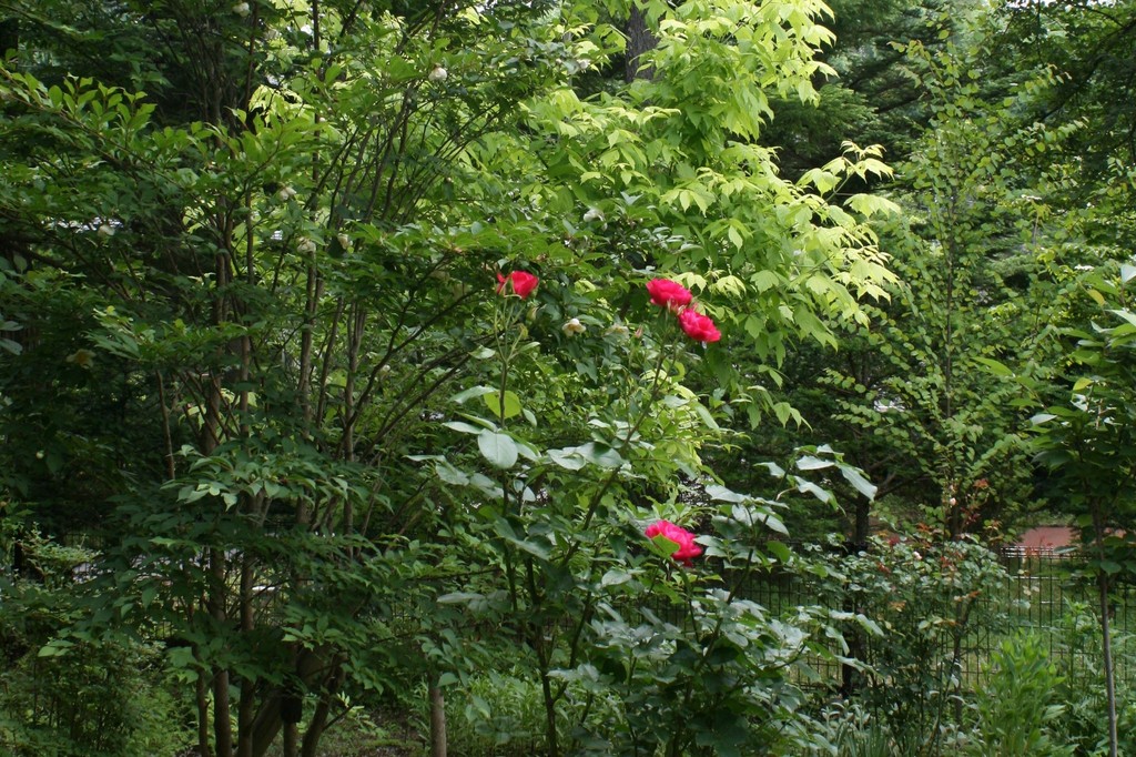 緑の濃淡の中に、真っ赤な薔薇の花。
