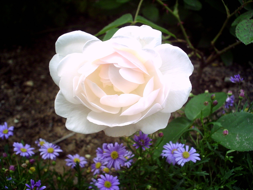 優しい色のバラですね。藤色の小花といいコンビネーションですね。とっても素敵です。