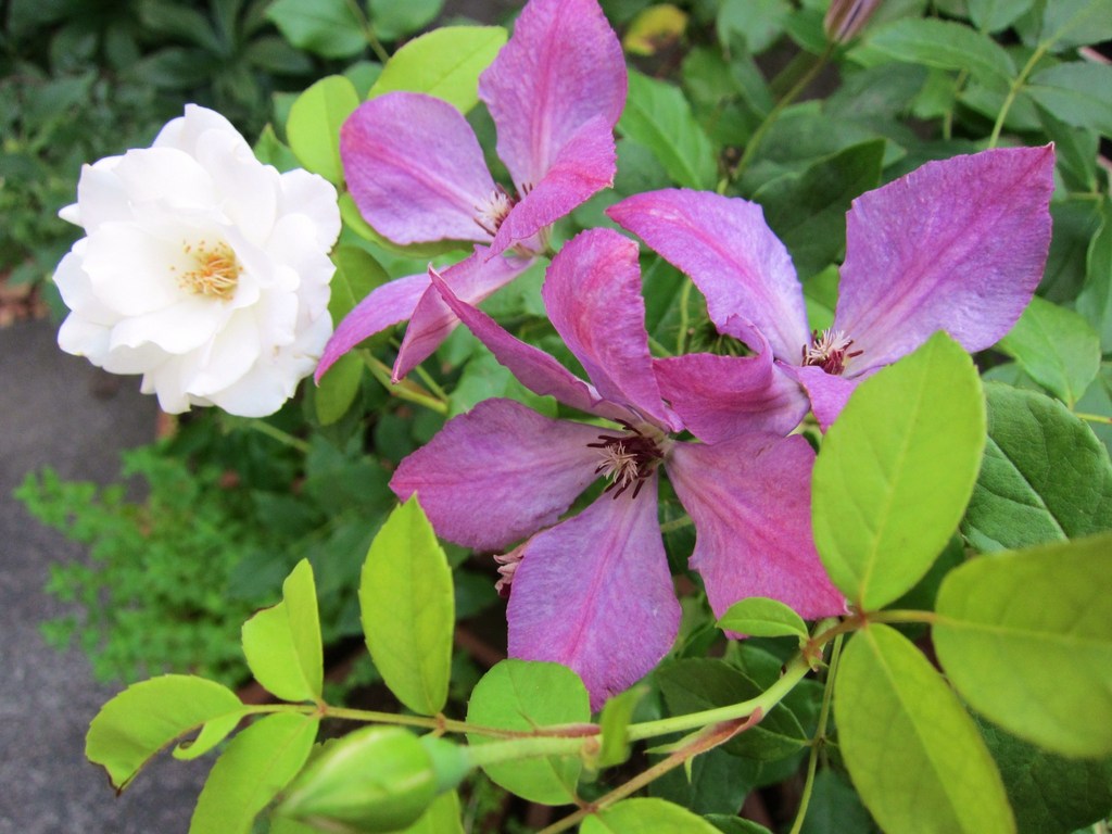 アイスバーグとクレマチスの花弁の色の対比だけじゃなく、それぞれのしべの色の対比も綺麗ですね。