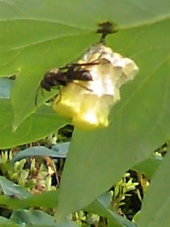 葉っぱの裏に蜂の巣作っちゃうんですね。毛糸の帽子を編むように・・・なんですか~いつも出来上がったのしか見たことないので面白いですね。五郎太さんは本当に昆虫に詳しいんですね。蜂も逃げないところをみると相思相愛なんですね^^