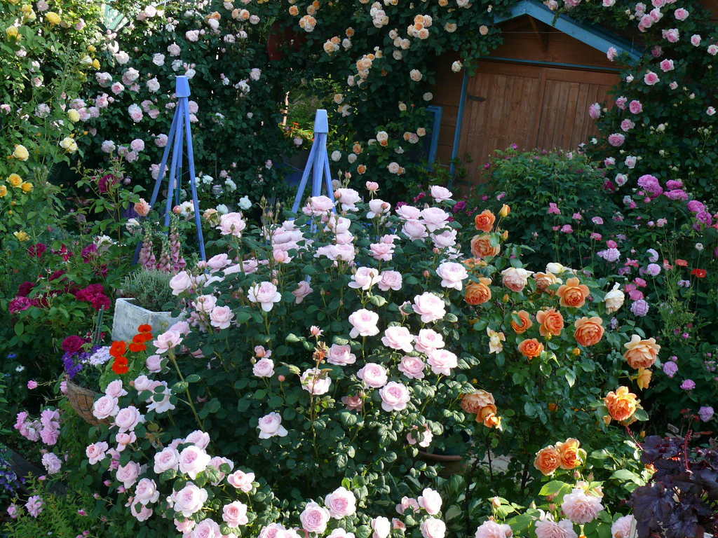 たくさん咲いてますね~!蕾よりも花の方が多い状態でしょうか。バラに包まれてうしろの小屋もベンチも見えなくなってきていますね。とっても豪華です^^