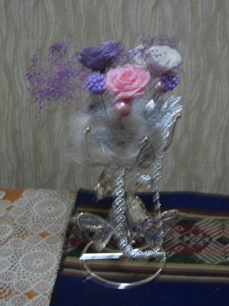 私もアレンジを3年ちょっと習っていましたが、撮影の時は作品が美しく見えるように先生が簡易スタジオを用意してくれました。板に布をかぶせて作品の後ろに置くだけです。それだけでずいぶん違って見えますよ^^ あと、柄布を一緒に写すのは基本的にNGです(アドバイス全部、先生の受け売りですが・・・^^; お役に立てば・・・です。)