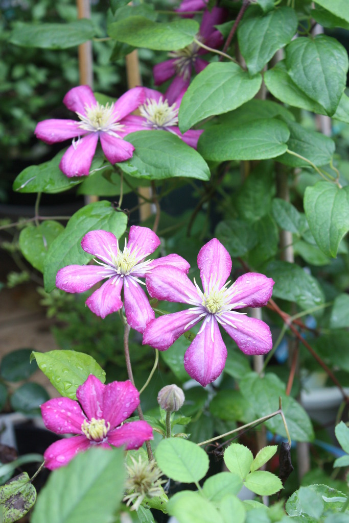 このクレマチス、先日アップした私の花びら6枚の可愛い子と呼んでいるクレマチスと同じみたいです。私も見切り品を買ったので何もわからなかったんです。ピグドリオンていうんですね、よかった~名前がわかって・・・。すみません、何の役にも立てなくて・・・でも新枝咲きのようですよね!?たぶん・・・。