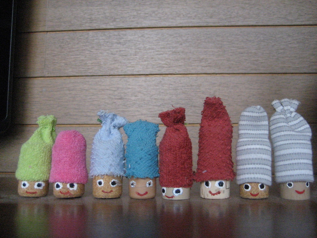 ワインのコルクに帽子をかぶせアクリル絵具で目を
