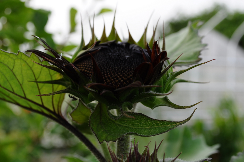 さすが夏の花 ひまわり!暑さをしっかり受け止めて、開こうとしています。蟻君控えて出番を待っています。