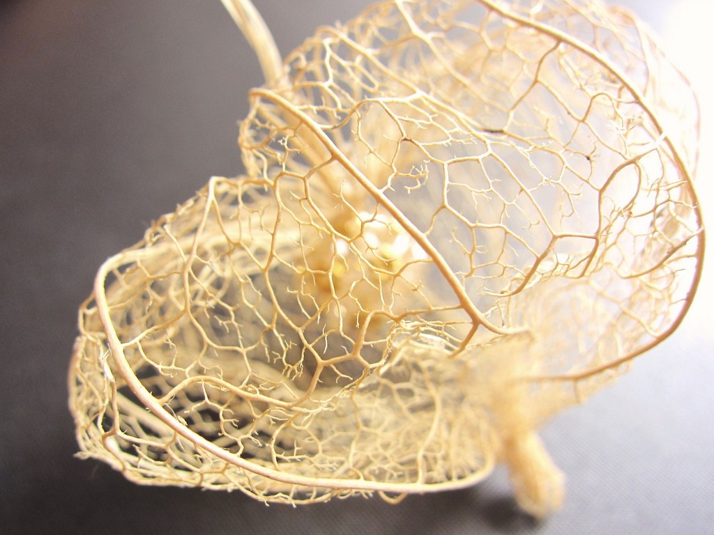 十数年前に海で拾ったほおずき、葉脈だけの姿で浜辺に転がっていました。海の塩分で葉脈だけになったのかと思っていたら昨日のアルムさんのほおずきを見て、自然にこうなることを知りました。