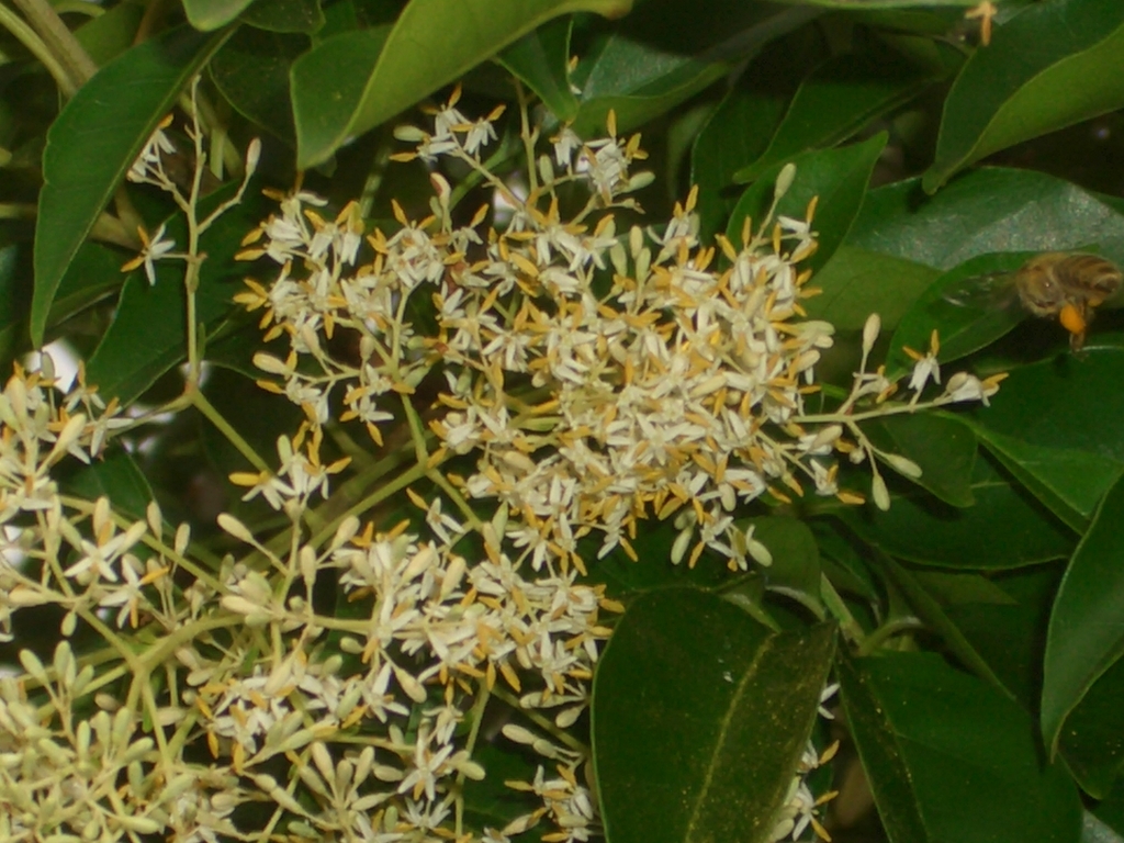 今朝、羽音で気が付いたのですが、ミツバチの大群がシマトネリコの花に群がっていました。一匹しか写っていないけど みんな花粉玉持ってました。(^_^;)