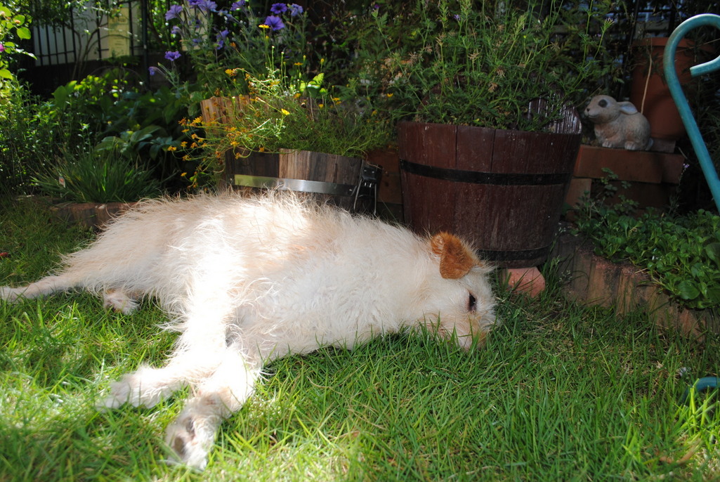 こんにちは。この暑さでは、ワンちゃんもたまりませんね。涼しい日陰を見つけて一休み^^