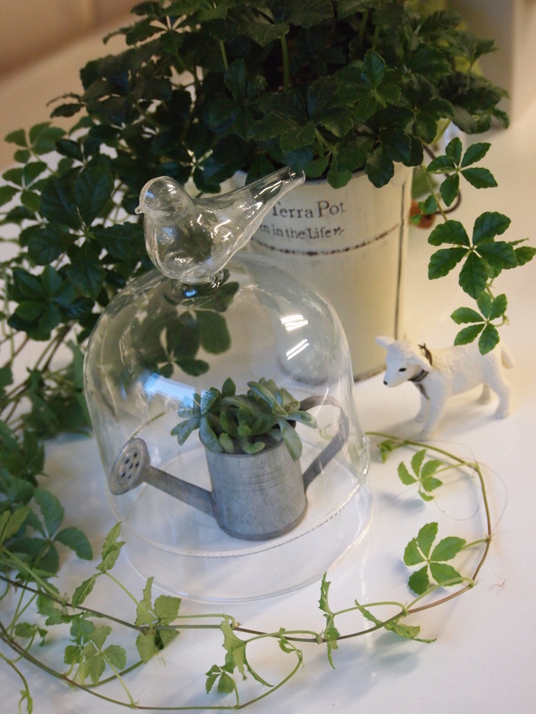 わぁ、素敵なアレンジ!ガラスの物を撮るのって難しいんですよね。中の小さなジョウロ、シュガーバインから考えると本当にすごく小さいようですね。