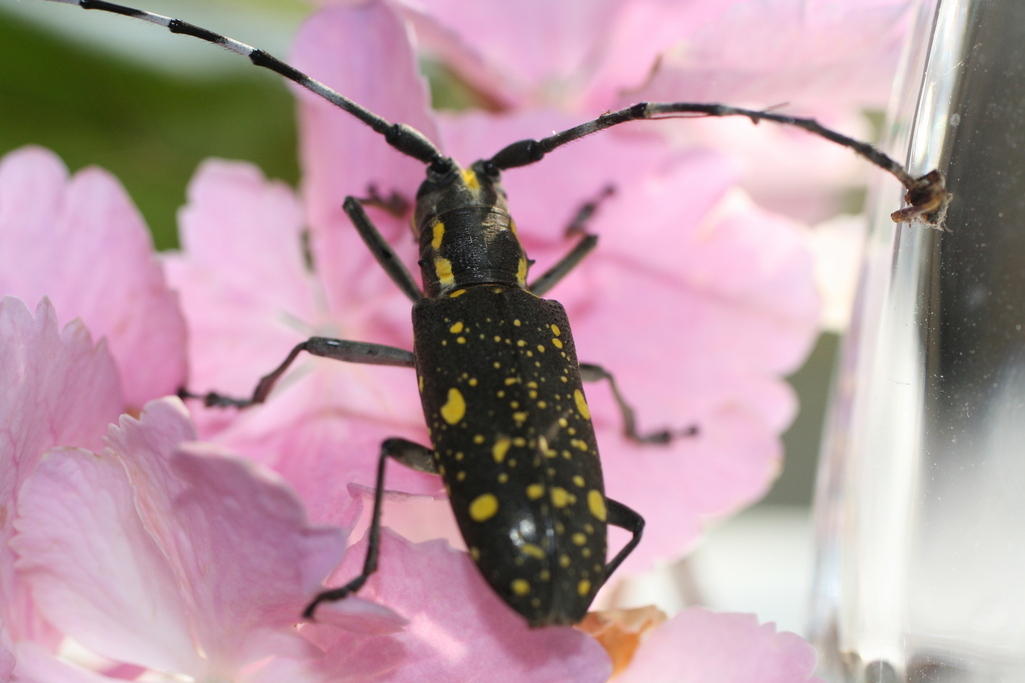 キボシカミキリ久しぶりに見ました~! 最近はゴマダラしか見てなくて・・。子供のころはカミキリムシ好きだったんですけど、バラや紅葉の敵なので、最近はあまり歓迎しません(笑)