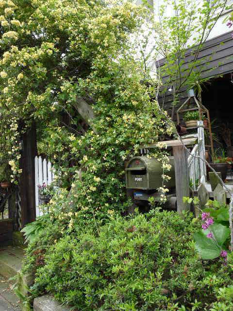 DIYエントランス。国鉄産業から買ってきた枕木80本の一部が活躍しています。植えたら勝手に大きくなった?モッコウバラ。満開よりこの頃がスキです♪♪