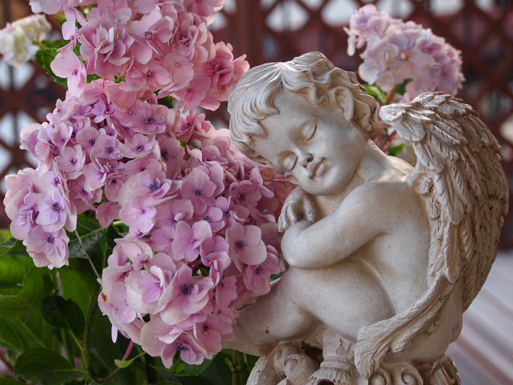 パステルピンクのアジサイと天使の表情が、幸せな気持ちにしてくれます。