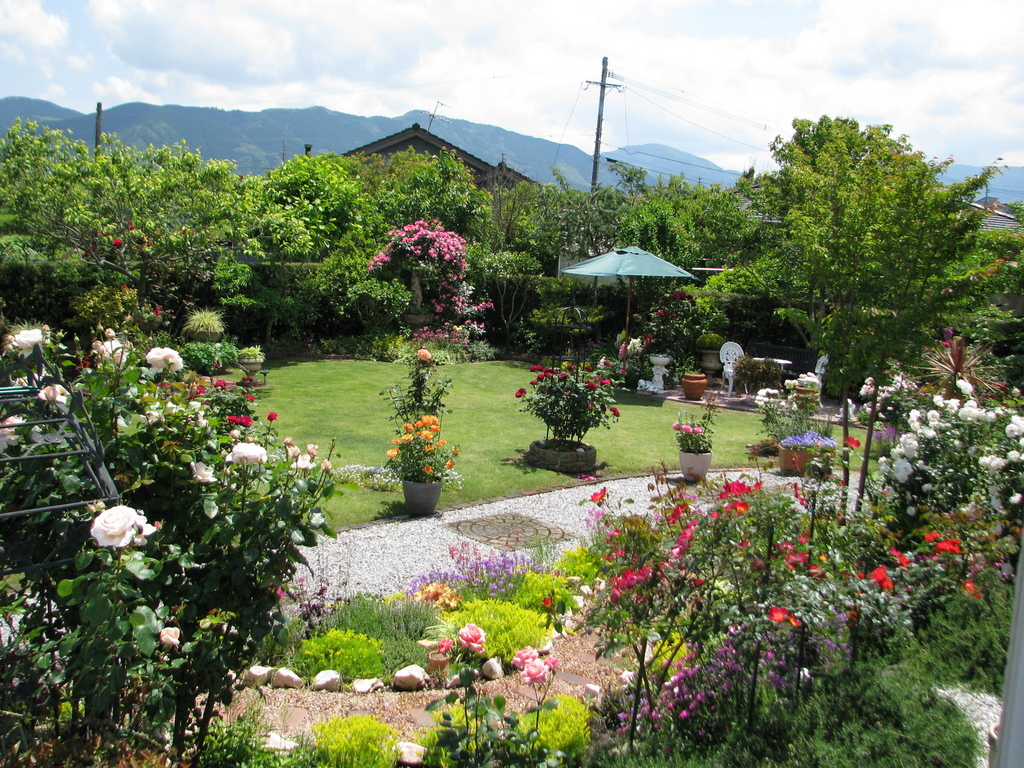 我が家の庭を北側から見たところです。南国でバラには厳しい環境ですが、この環境に合った育て方を模索して3年目。まだまだこれからです。