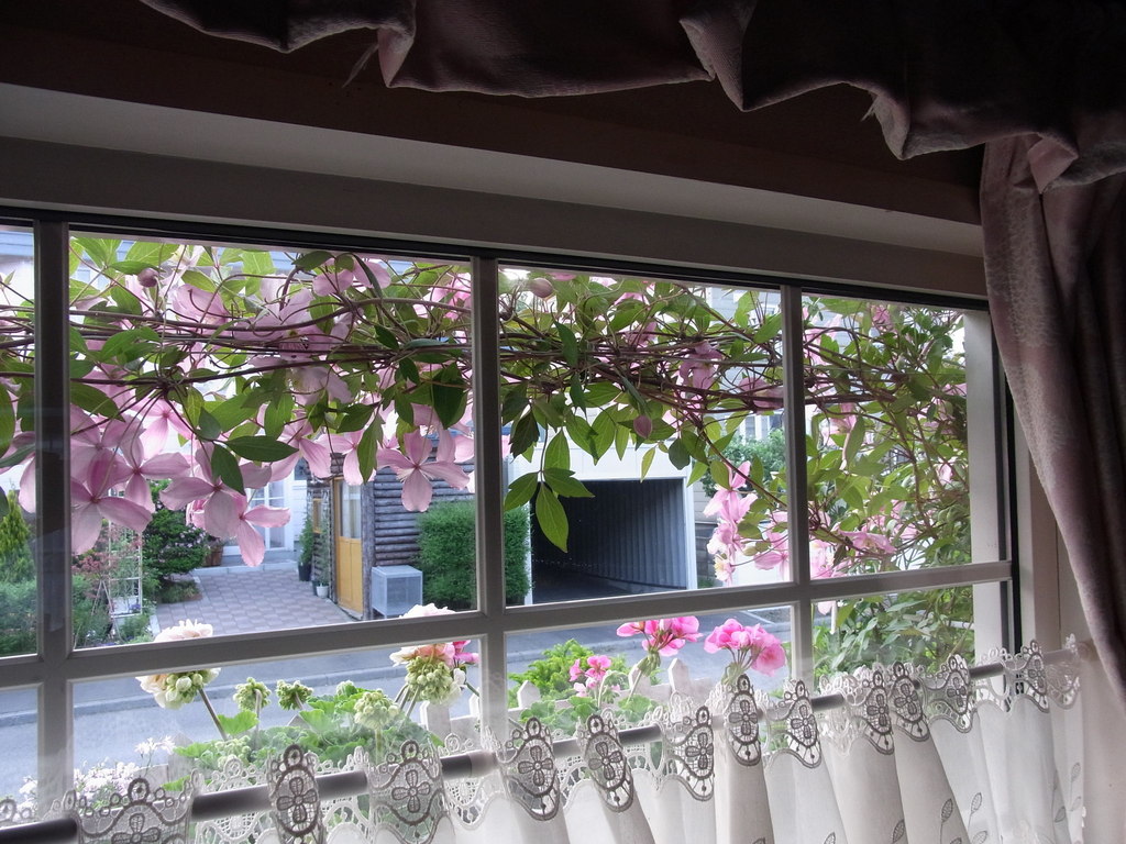 ミキティさん おうちの中からも見たくてこの位置に誘引しました。なので、このクレマチスが咲く時期はとっても楽しいです。外を通る方・・たまーに見ている方がいるそうです。