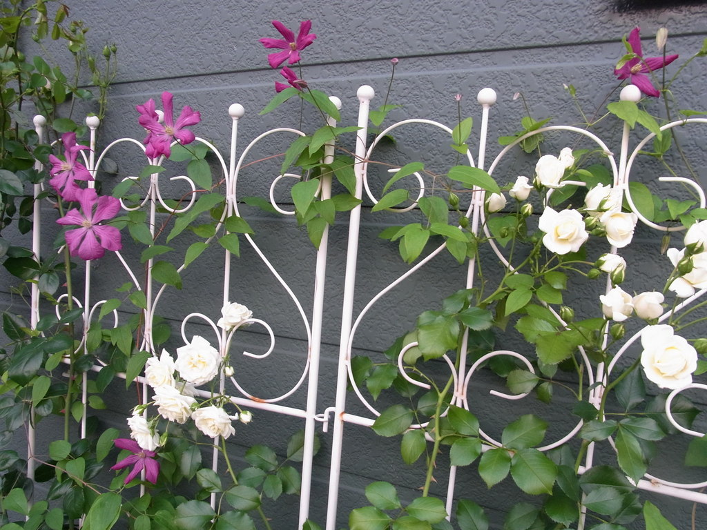 クレマチス二種、バラのバニラボニカとニュードーンを絡ませています。
