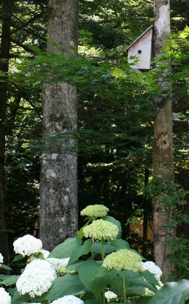 庭の木にかけてある巣箱に、今頃になってシジュウカラのご夫妻がやってきて巣作りをしています。巣箱の入口に頭を出しているのが見えるかな。