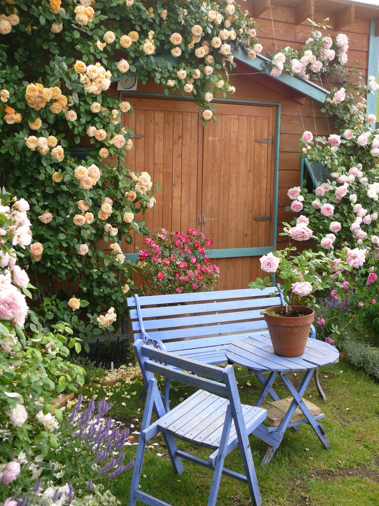 ブルーのいすがいいアクセントになって、素敵なバラの庭ですね。