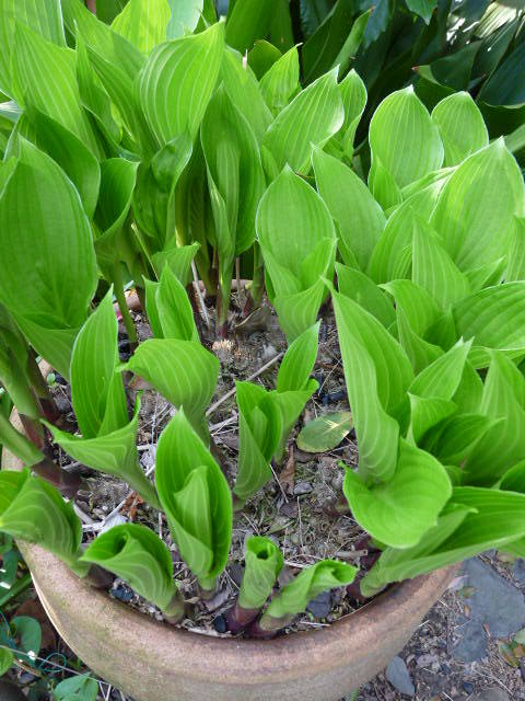 4月頃の姿です。タイ製テラコッタ鉢に植え込みました。元気をもらえるギボウシの芽吹っ、明日もがんばろぉ~!