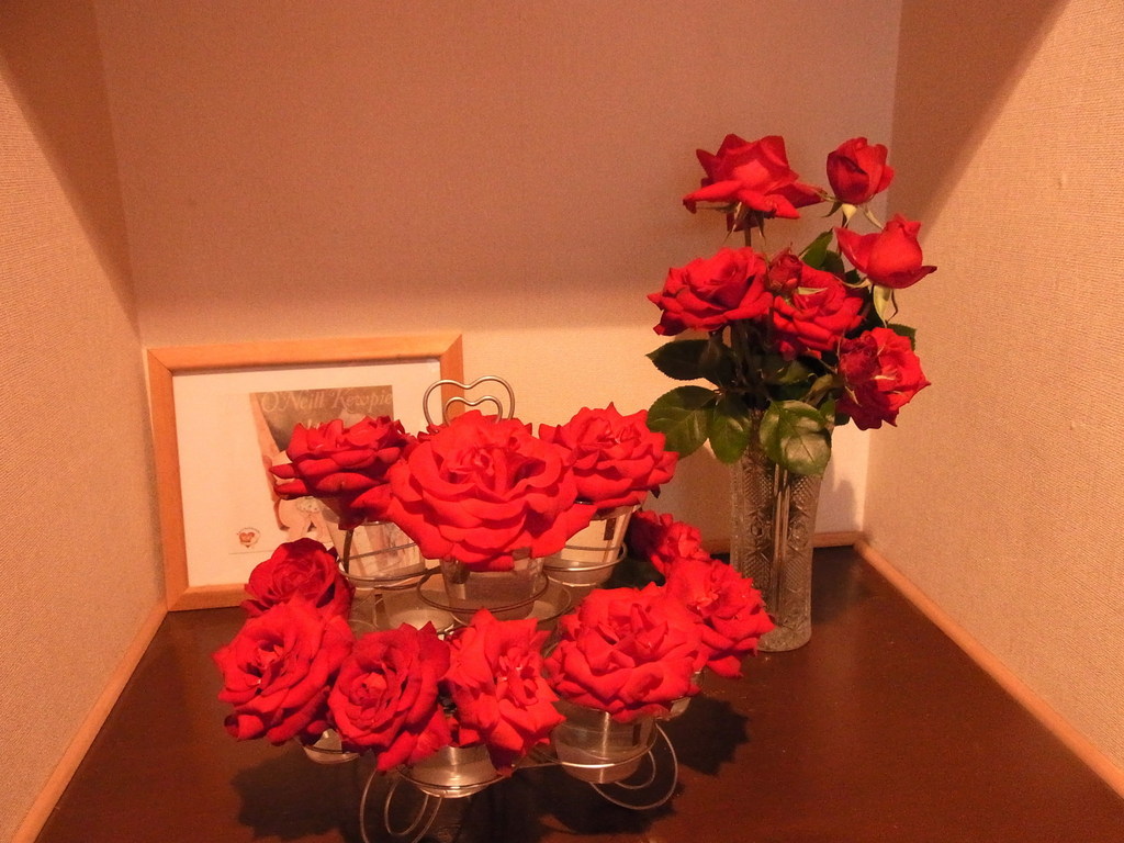 留守宅の花摘みで持ち帰ったので、花首だけですが、マフィンスタンドに飾ってあげました。