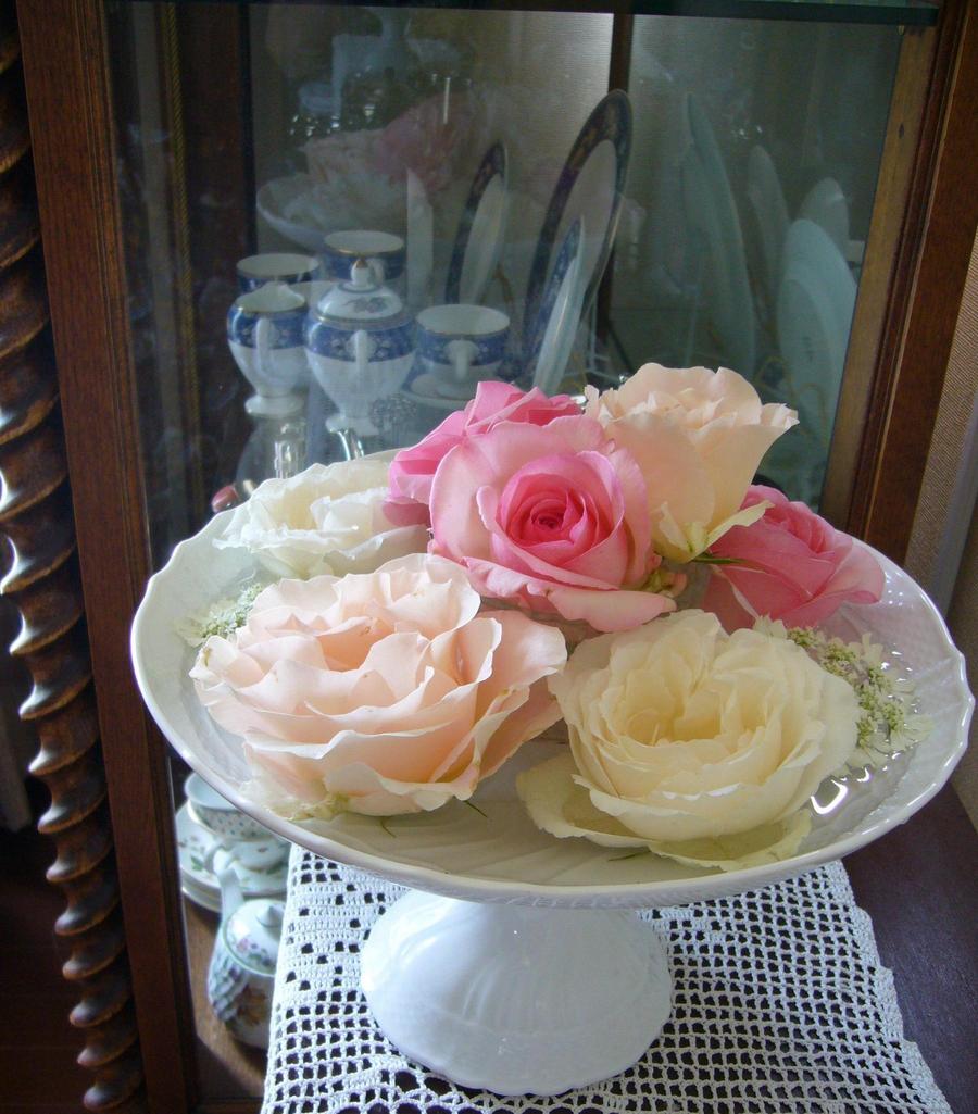 朝摘んだバラの定位置です。