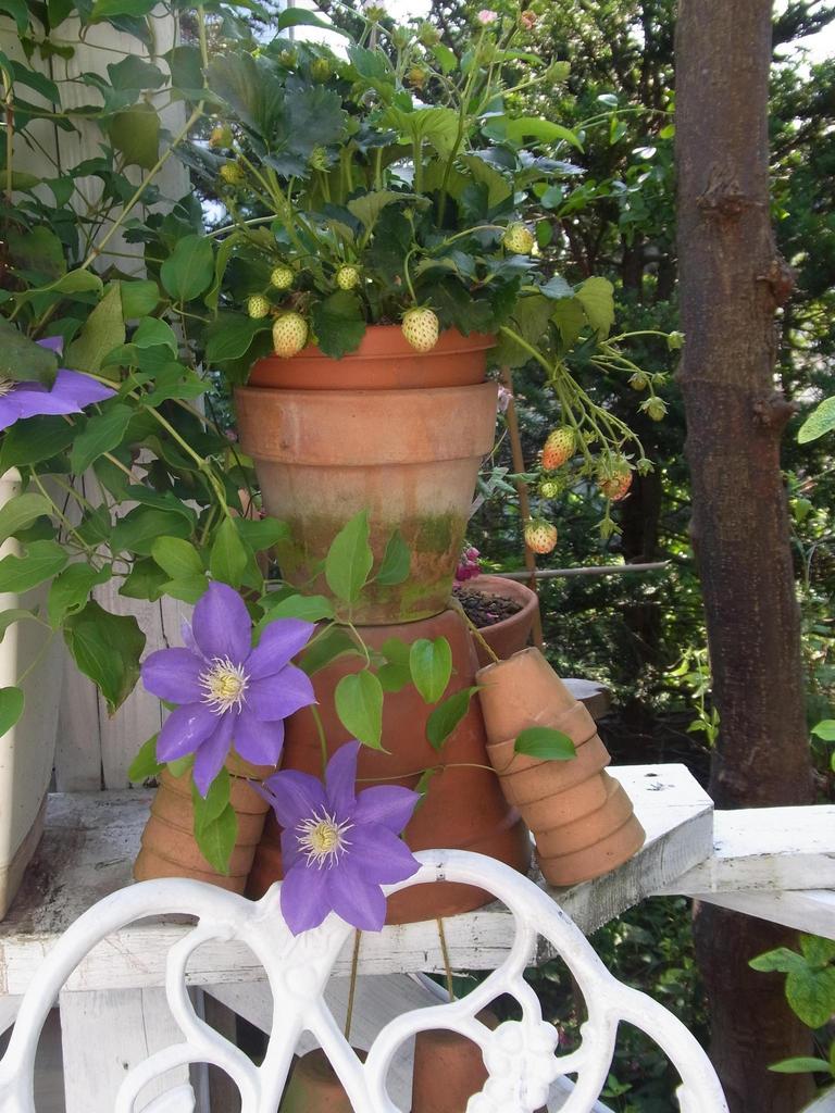 このまだ色付き始めたばかりのイチゴと濃い紫のクレマチスの取り合わせ!!可愛いですね!!お上手!!
