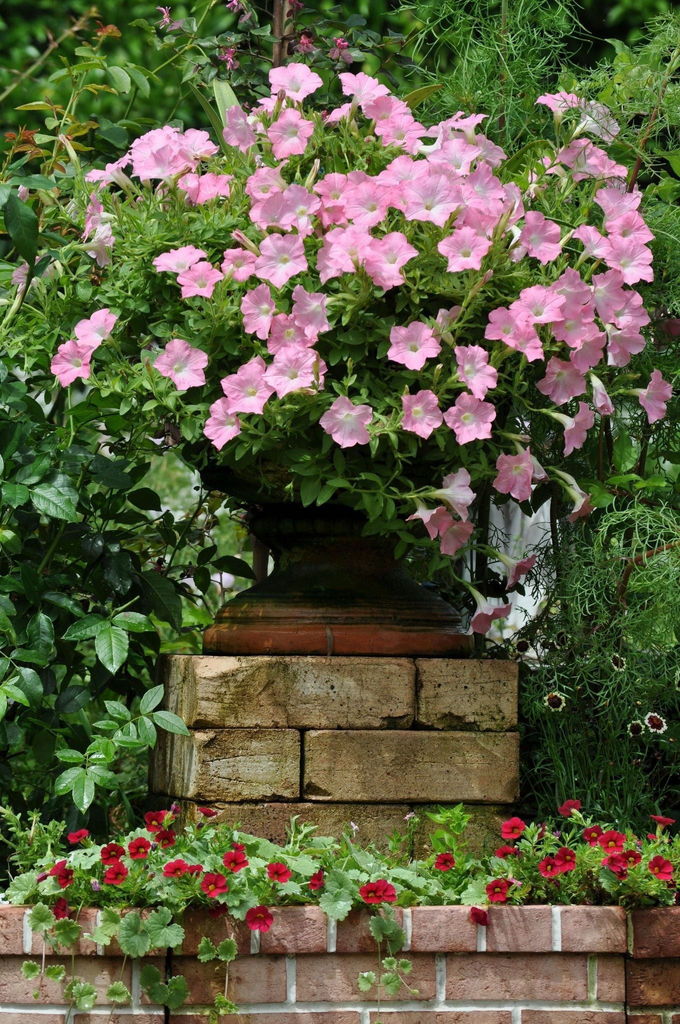 足元に咲く赤がアクセントになって、素敵です♪苔むした鉢がいい感じです~(*^_^*)