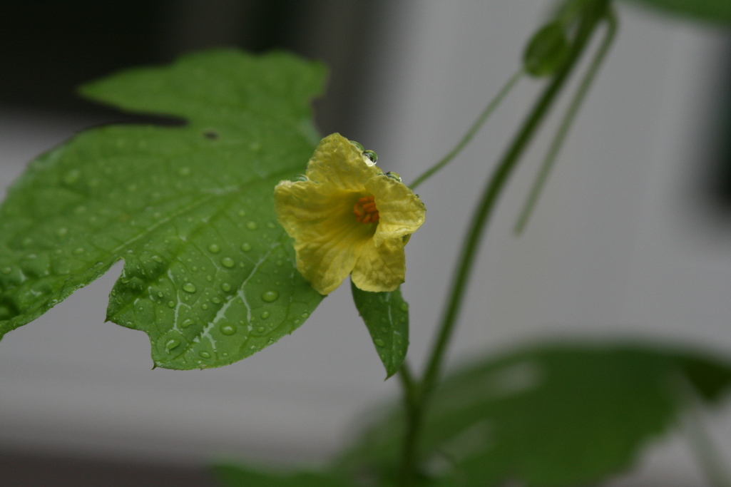 サンルームの前にグリーンカーテンを作っているのですが、5~6月が予想以上に寒かったので今頃になって伸び始めたところです。ゴーヤもやっと花をつけてくれました。