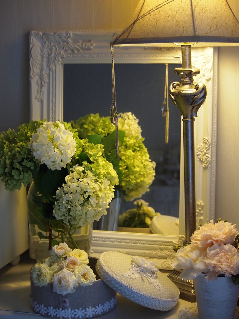 素敵!!置いてあるもの全てが素敵です。白の中にアナベルの薄い緑が溶け込んでますね。