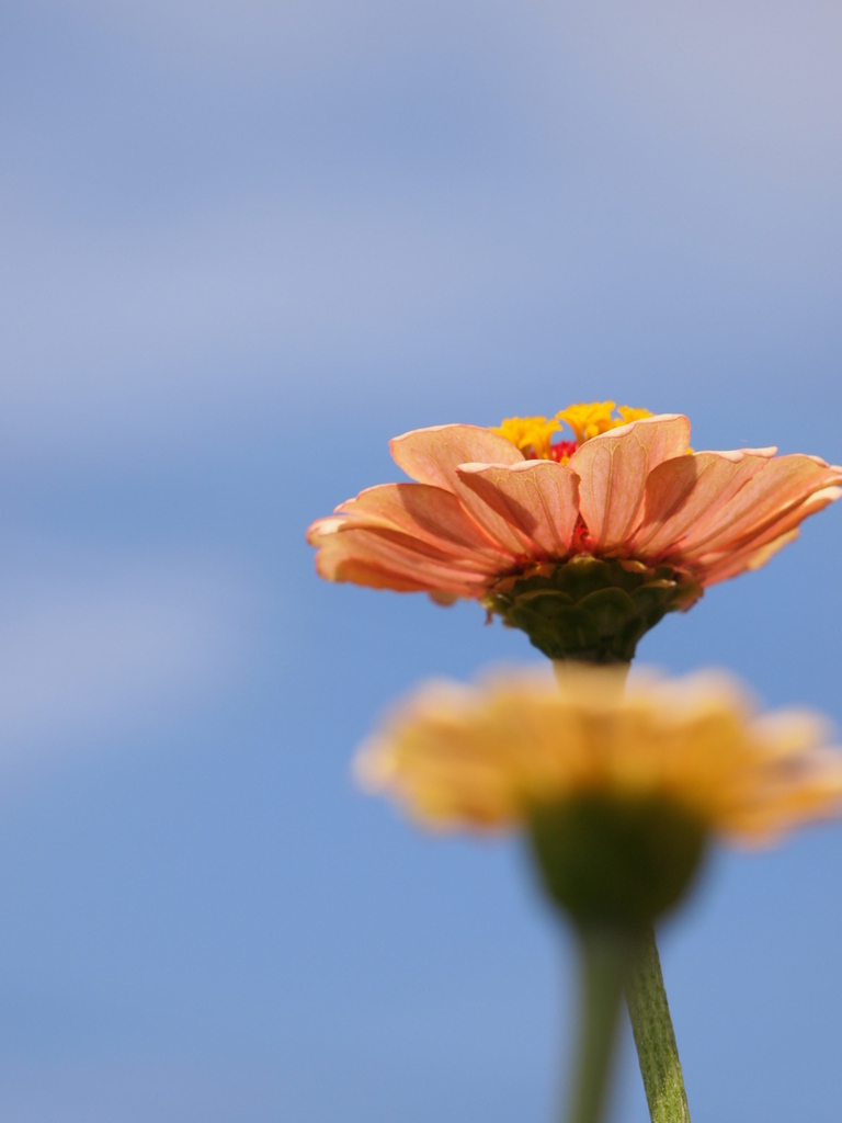 青空に向かってヒャクニチソウが、背伸びしているみたい! きっと、ひまわりになりたいのかも・・・