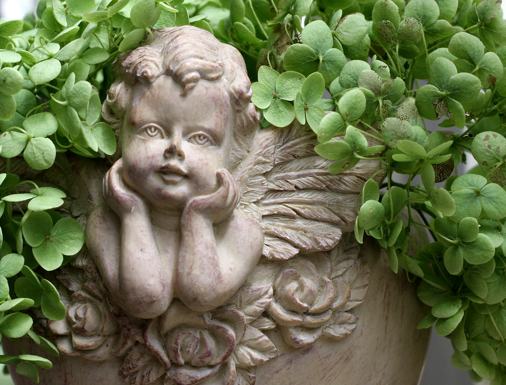 グリーンになったアナベルを載せているのはフラワーベースのエンジェルです。存在感ありすぎて花を活けるのは難しい。
