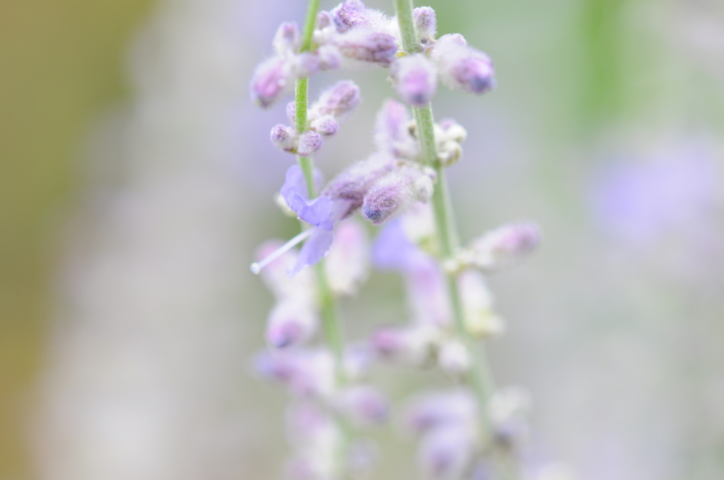もこもこの中から、青い涼しげな花がとび出してきました。ロシアンセージです。
