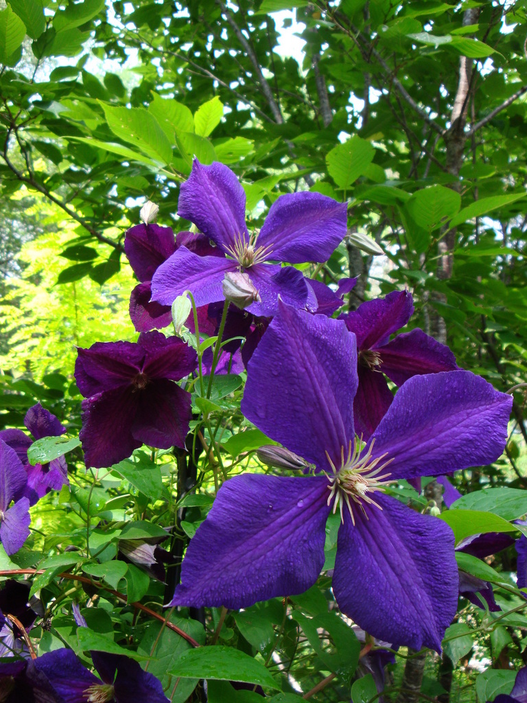 濃い紫のクレマチス。花びらが4枚のと5枚のがあります。なぜでしょう・・・ネ
