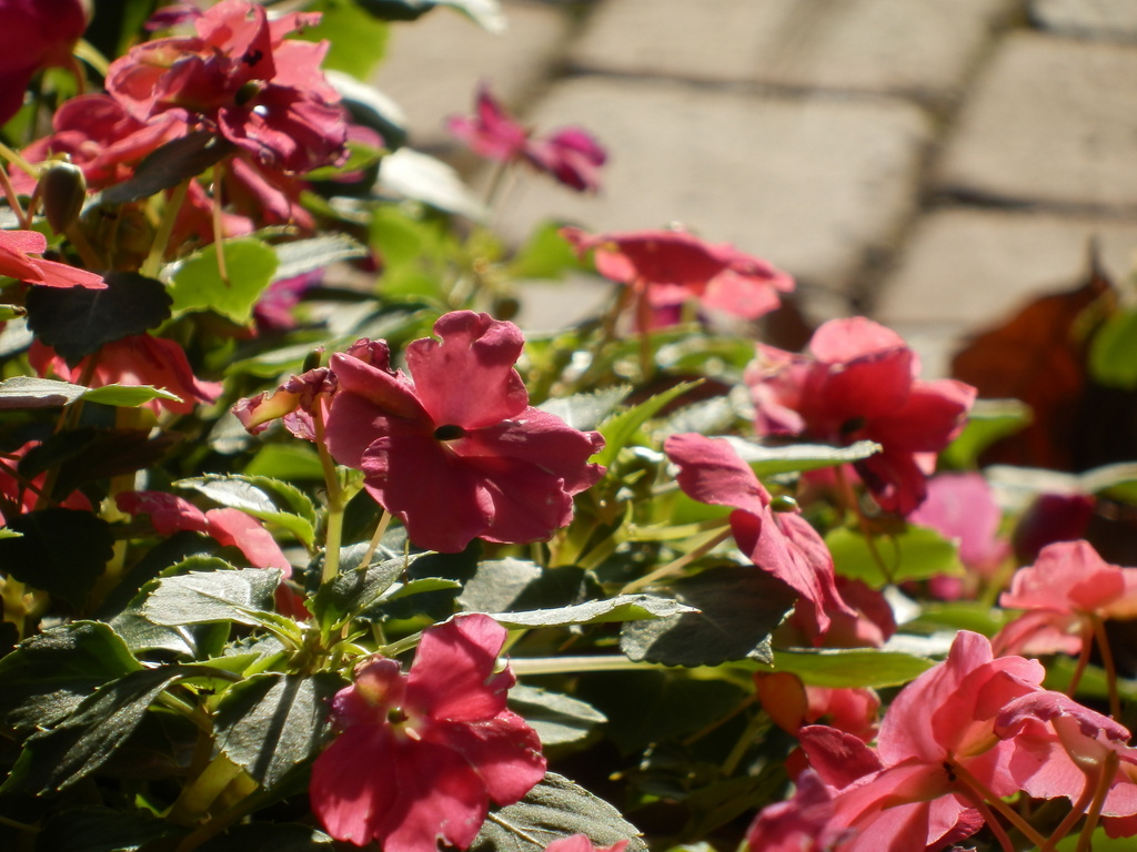 金木犀の株元に植えたインパチェンスは、元気に咲いています。日向のは、可愛そうな状態。