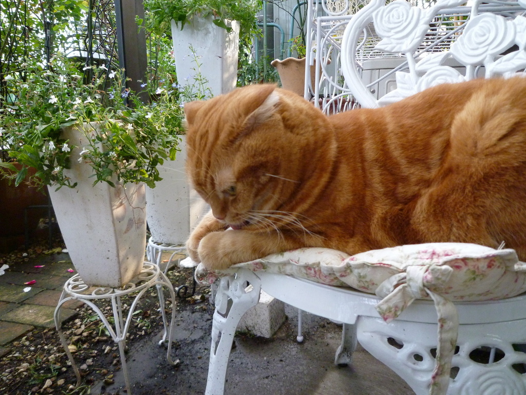 お庭の白いアイアンや鉢とミルキーちゃんの毛色がとてもよく似合ってます。