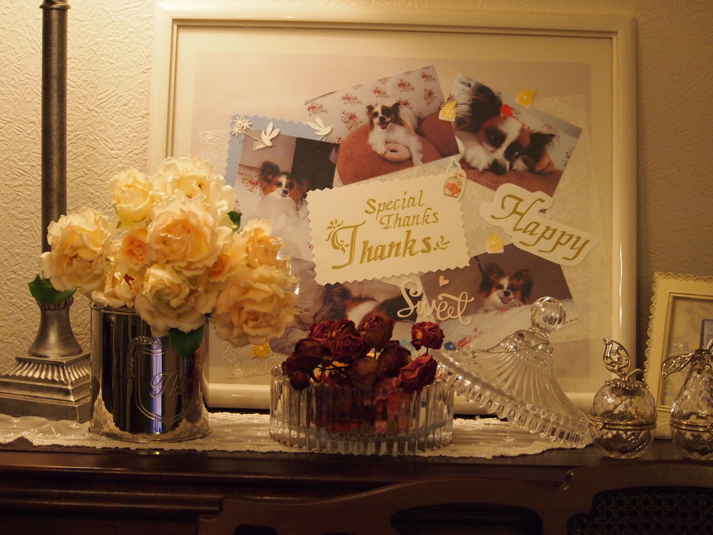 バラと愛犬と可愛い小物、眺めているだけでHAPPYになりそうですね^^ りんごと梨の置物、とっても可愛い♡ 私もほしいです~^^