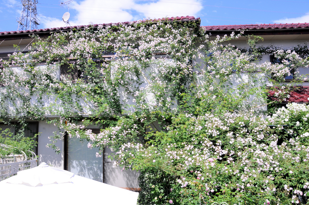 このバラの誘引だけでも大変な労働ですね、素晴らしい
