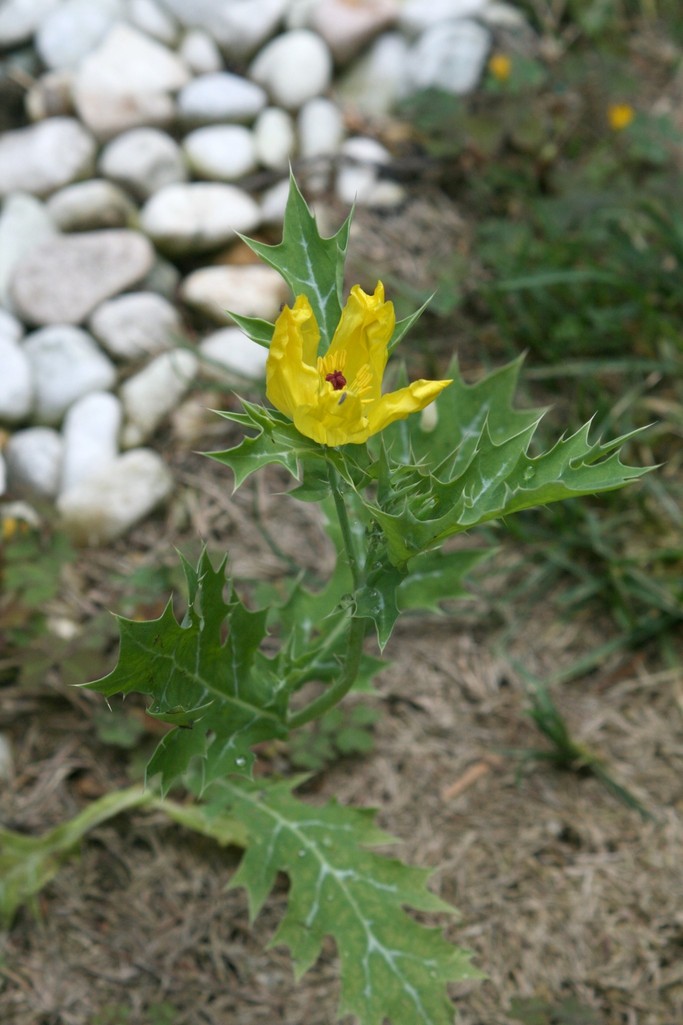 庭の通路と芝生の境目の芝が枯れているところに、アルゲモネ・メキシカーナのこぼれ種が芽を出して綺麗に咲いてくれました。