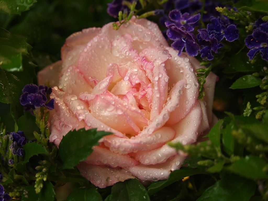 雨の中でもイキイキしてますね。紫色の小花との愛称も抜群、素敵な1枚です♪