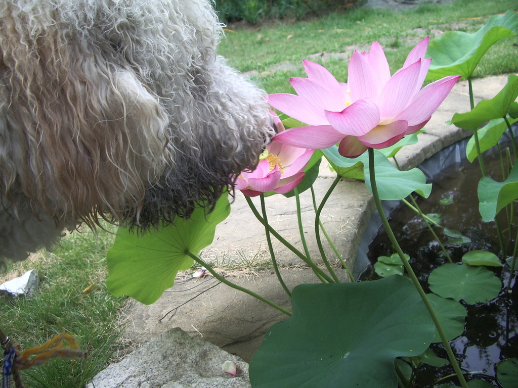 こんにちは。ご自宅に蓮の池を持ってらっしゃるなんて素敵ですね^^ かわいいワンちゃんによく似合っています。JACKくん、食べちゃだめですよぉ~!