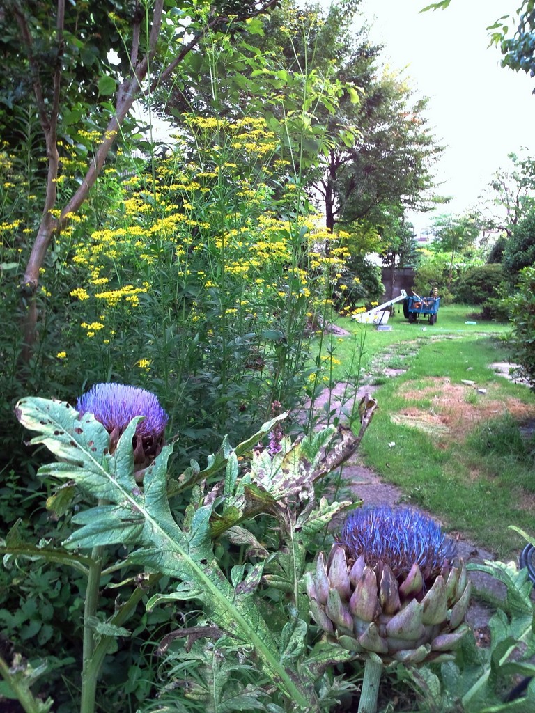 我が家のアーティチョークも小株を残して花後に枯れてしまいました。ず~っと元気でいてほしいですよネ。 話は違いますが、後ろにちょこっと写ってるガーデングッズ、いい感じですね~^^