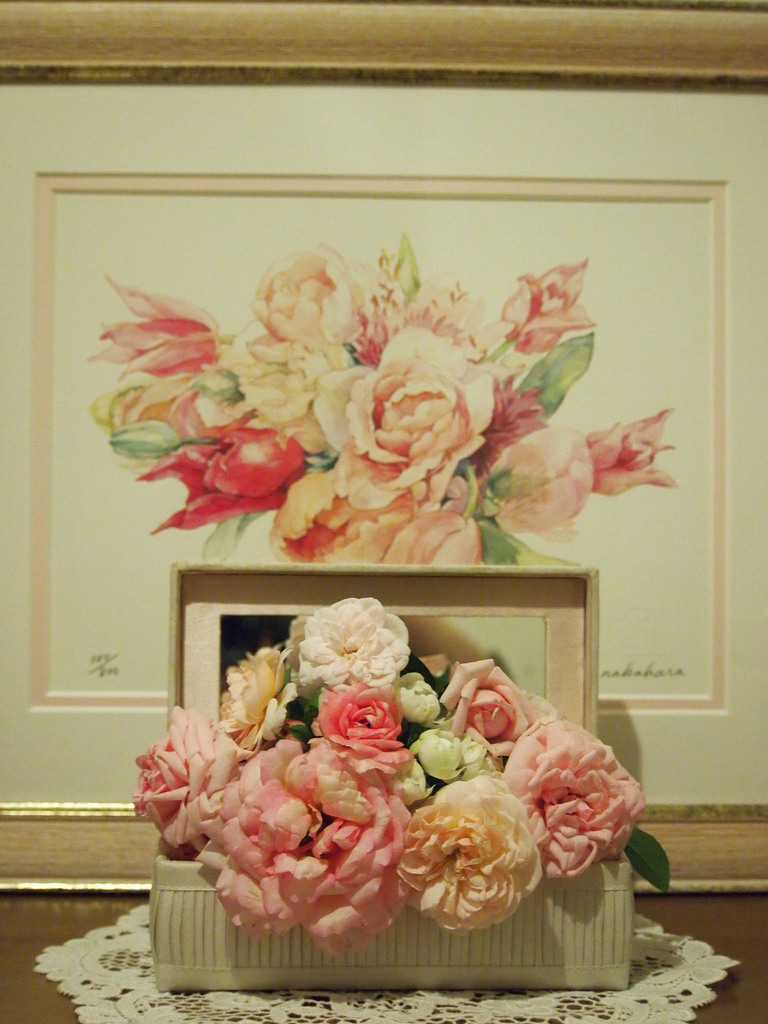 宝石箱に薔薇、素敵な発想ですね。バックの額の薔薇ともよくマッチしていますね