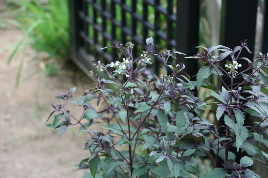 今日の一枚 ユーパトリウーム、銅葉と小さな白い花が魅力的、庭のアクセントに・・。毎年出てきます。