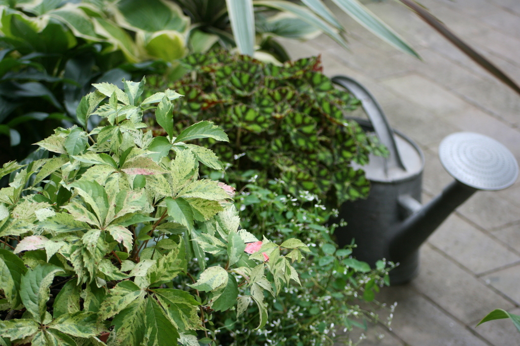 今日の一枚 お気にいりのリーフ、斑入りヘンリーヅタ、紅葉もきれいです。後ろは不思議な色をしたベコニア、ピンクの花が咲きます。ユーホルビアダイアモンドフロストなど。