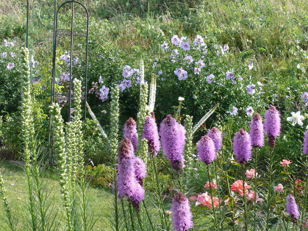 色合いがさわやかで美しいですね~! 紫のブラシみたいなのは何ですか?群生すると華やかで、すごくいい感じです(*^^*)