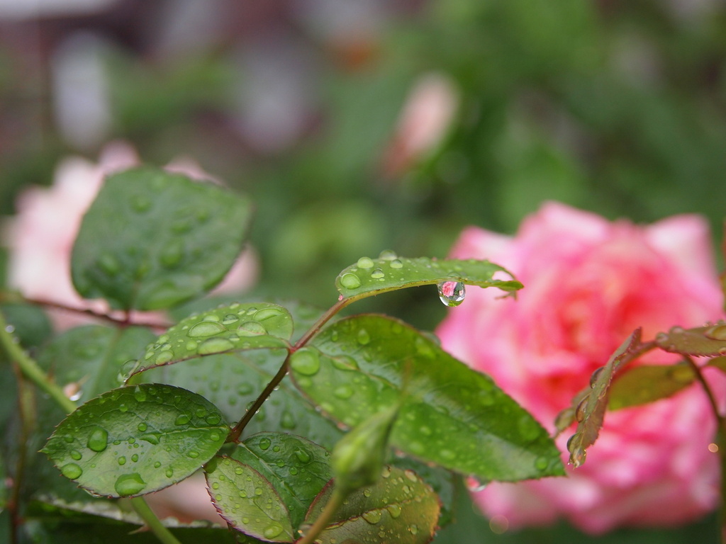 小さい雫の中の薔薇におはようって・・・葉っぱについた雨粒の中に…薔薇が写っています♡