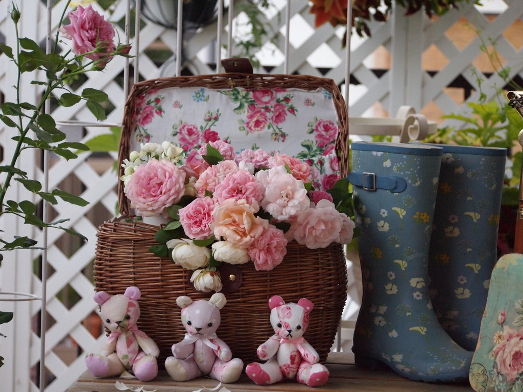 バスケットもバラを飾ればかわいいインテリアですね。長靴もはくにはおしいかも?(^_^;)